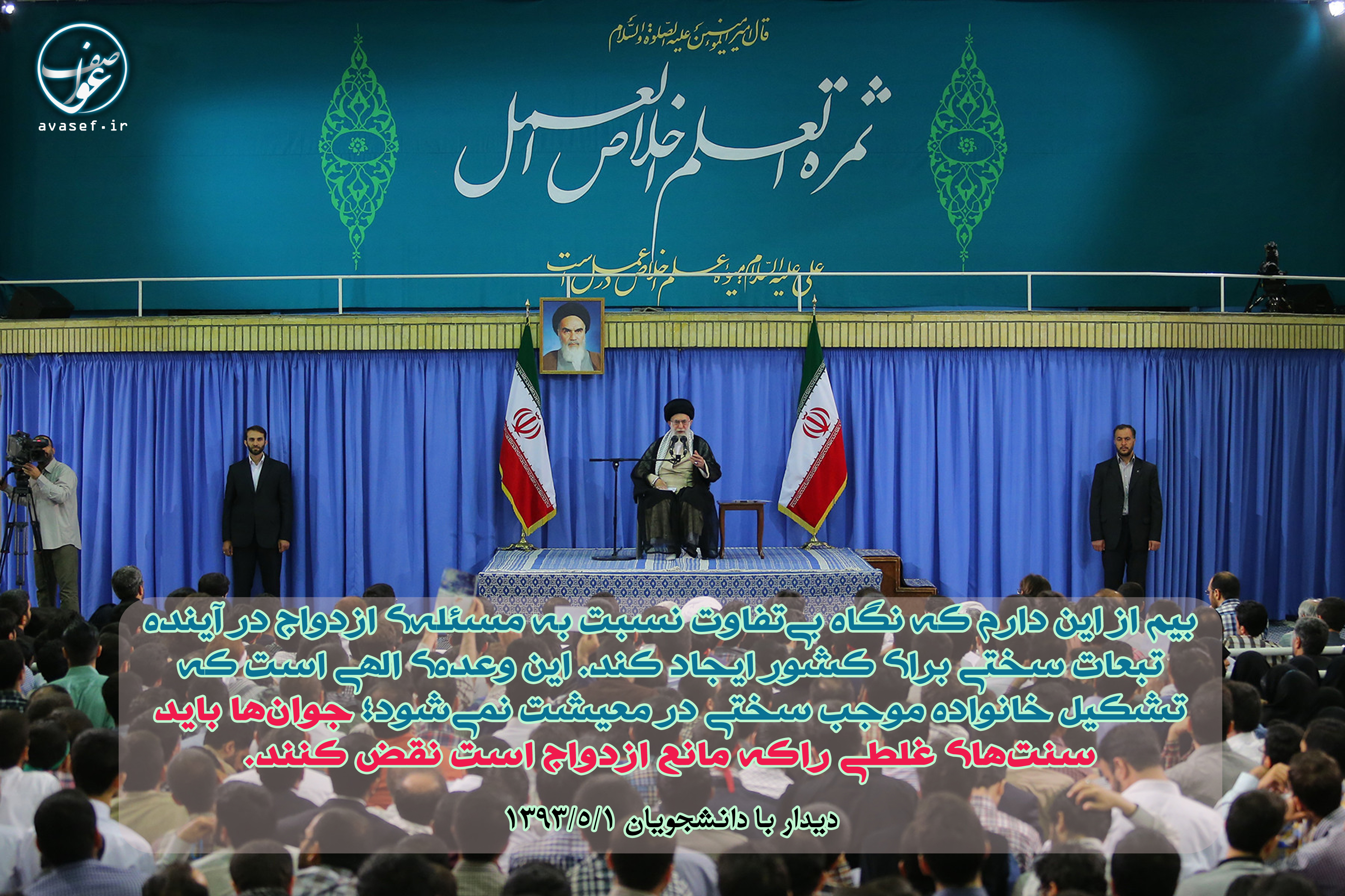 مدت مدیدیست رهبر معظم انقلاب بر روی ازدیاد نسل شیعه تأکید دارند؛ امروز هم در مورد ازدواج صحبت فرمودند؛ به نظرم مهمترین وظیفهای که امروز بر گردن ما جوانان نهاده شد، همین یک جملهست: "جوانها باید سنتهای غلطی را که مانع ازدواج است نقض کنند"